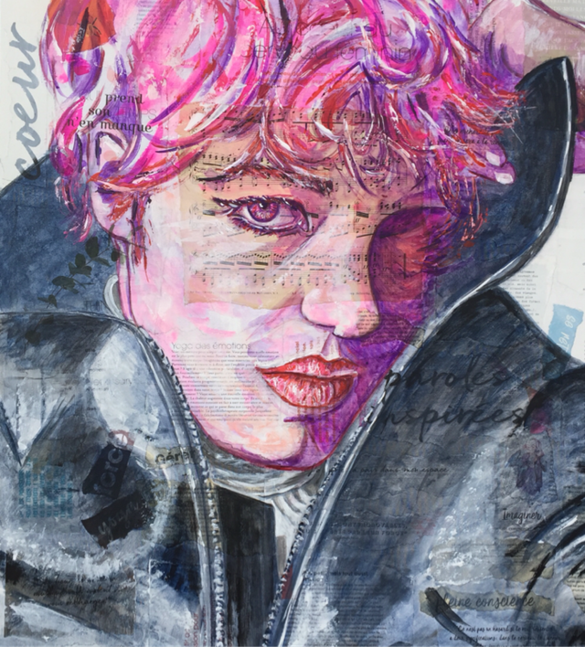 Portrait en rose d’une jeune femme androgyne qui dissimule une part d’elle-même. Entre douceur, force et rébellion, l’œuvre explore les masques que nous portons et la quête d’identité intérieure.