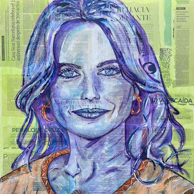 Un portrait lumineux de Pénélope Cruz, entre bleu apaisant, touches d’orange Chanel et collages en espagnol. Une ode à la mode, au cinéma et à la culture espagnole