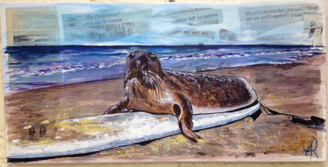 Peinture sur collages représentant le phoque You revenu plusieurs années sur les plages du Bassin